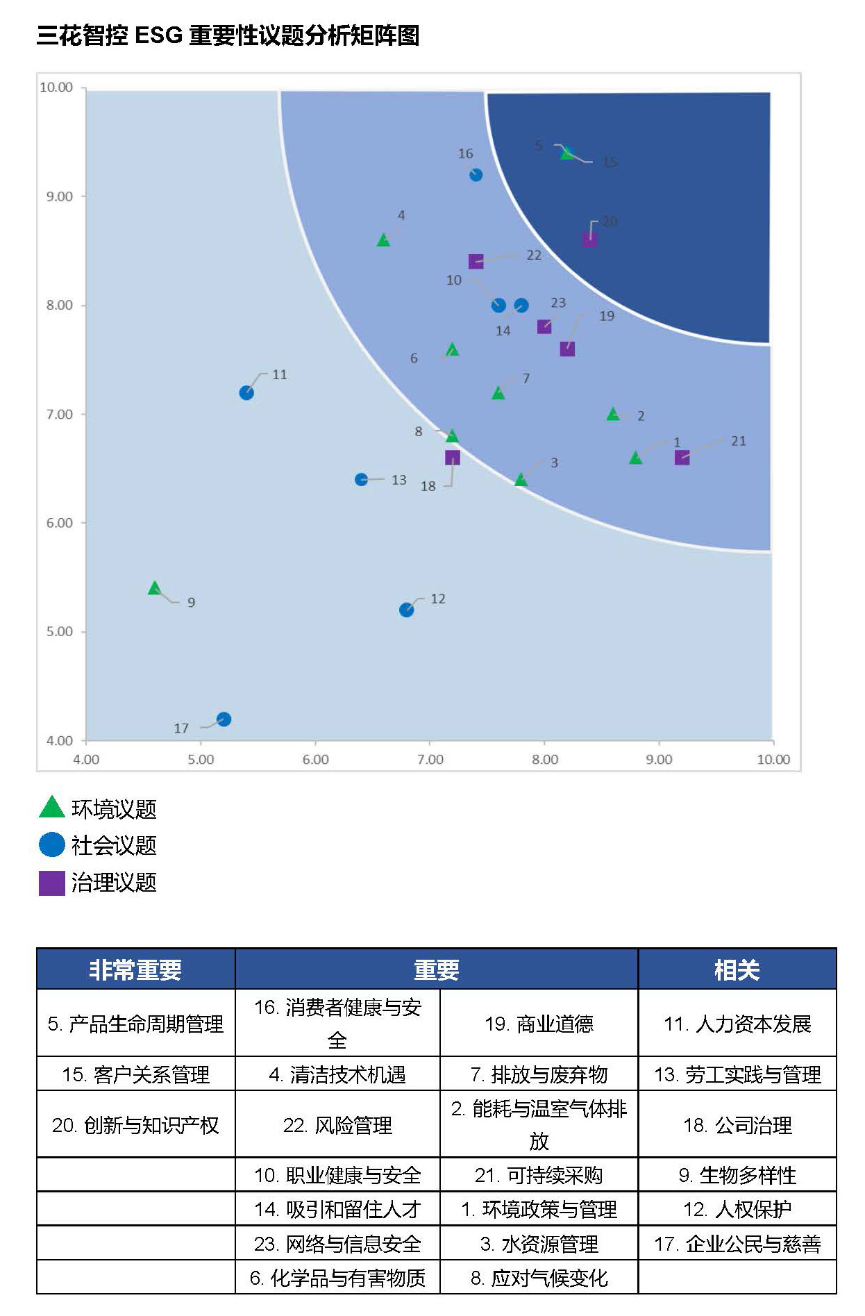 公司制定了可持續(xù)發(fā)展規(guī)劃及目標,梳理出23個環(huán)境、社會、公司治理相關(guān)議題,并進行了ESG重要性議題分析。