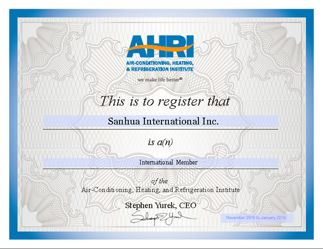 This November, AHRI announced Sanhua International Inc. has been listed as an International Member company of the Air-Conditioning Heat Transfer Products Section. This is the second products section member since 2016 when Sanhua was approved as an international member of Flow and Contamination Control Products Section. This marks SANHUA’s further market status improvement in the US air-conditioning, refrigeration and heat pump.