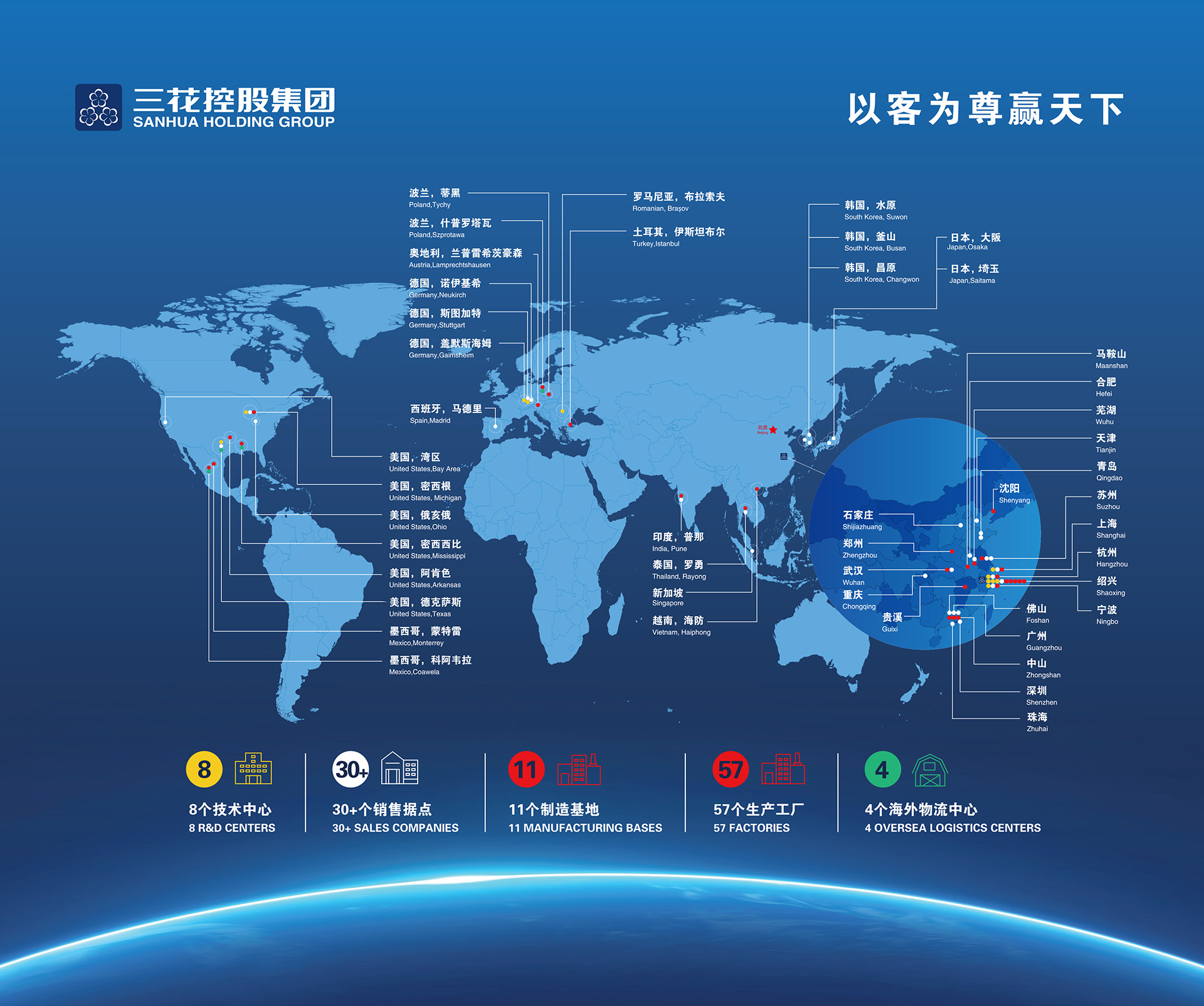 三花全球工業(yè)園, 本地化服務(wù),提升應(yīng)答速度,優(yōu)化物流, 提升質(zhì)量控制力度和效果, 提升精細化生產(chǎn), 全球超過14個生產(chǎn)基地。